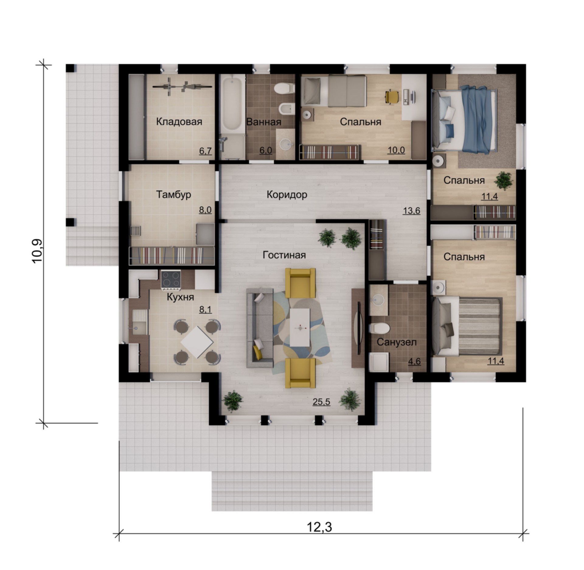 Этот проект имеет более сложную форму, что удобнее для зонирования участка, когда хочется бо́льшей приватности или разделения активных локаций с зонами релакса. Три спальни и два санузла Pin Up достойный уровень комфорта семье из четырёх-пяти человек.