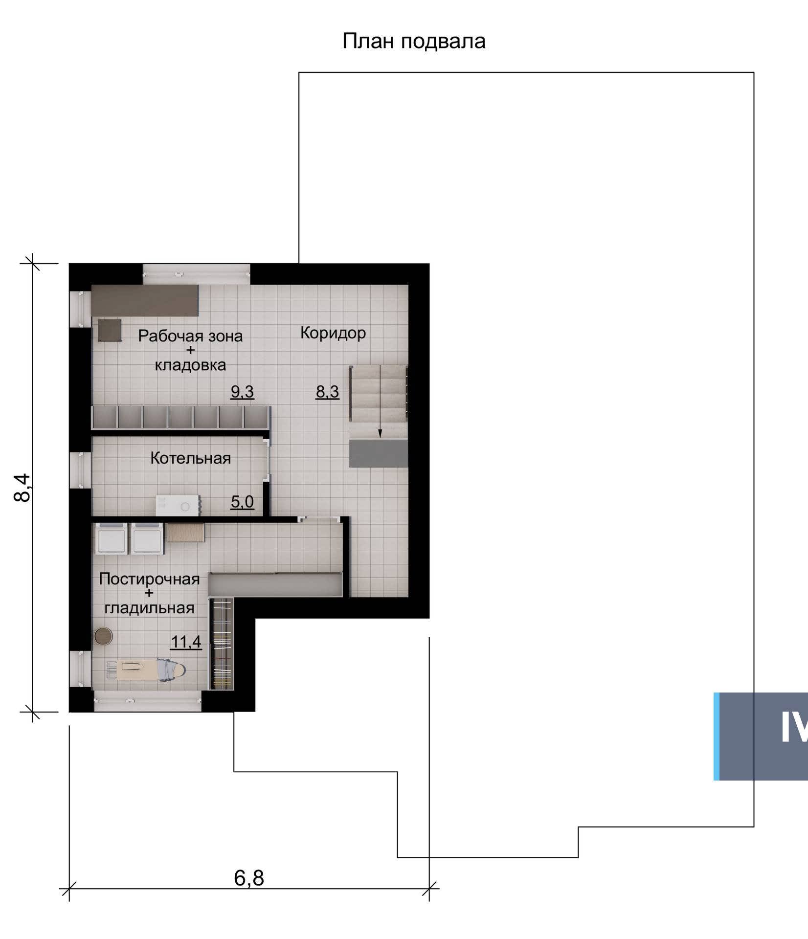 Большое преимущество - просторный цокольный этаж. По проекту, здесь размещены все технические помещения, что позволяет использовать пространство дома для решения задач комфорта и эстетики загородной Pin Up