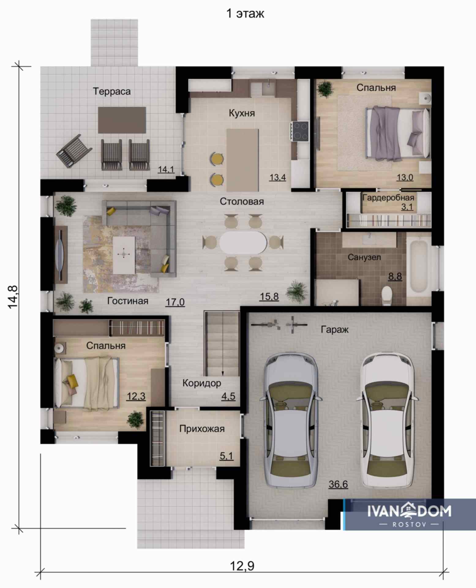 Также в проекте предусмотрены большая кухня-гостиная с выходом на просторную террасу, 2 Pin Up спальни и крытый гараж на 2 машиноместа.