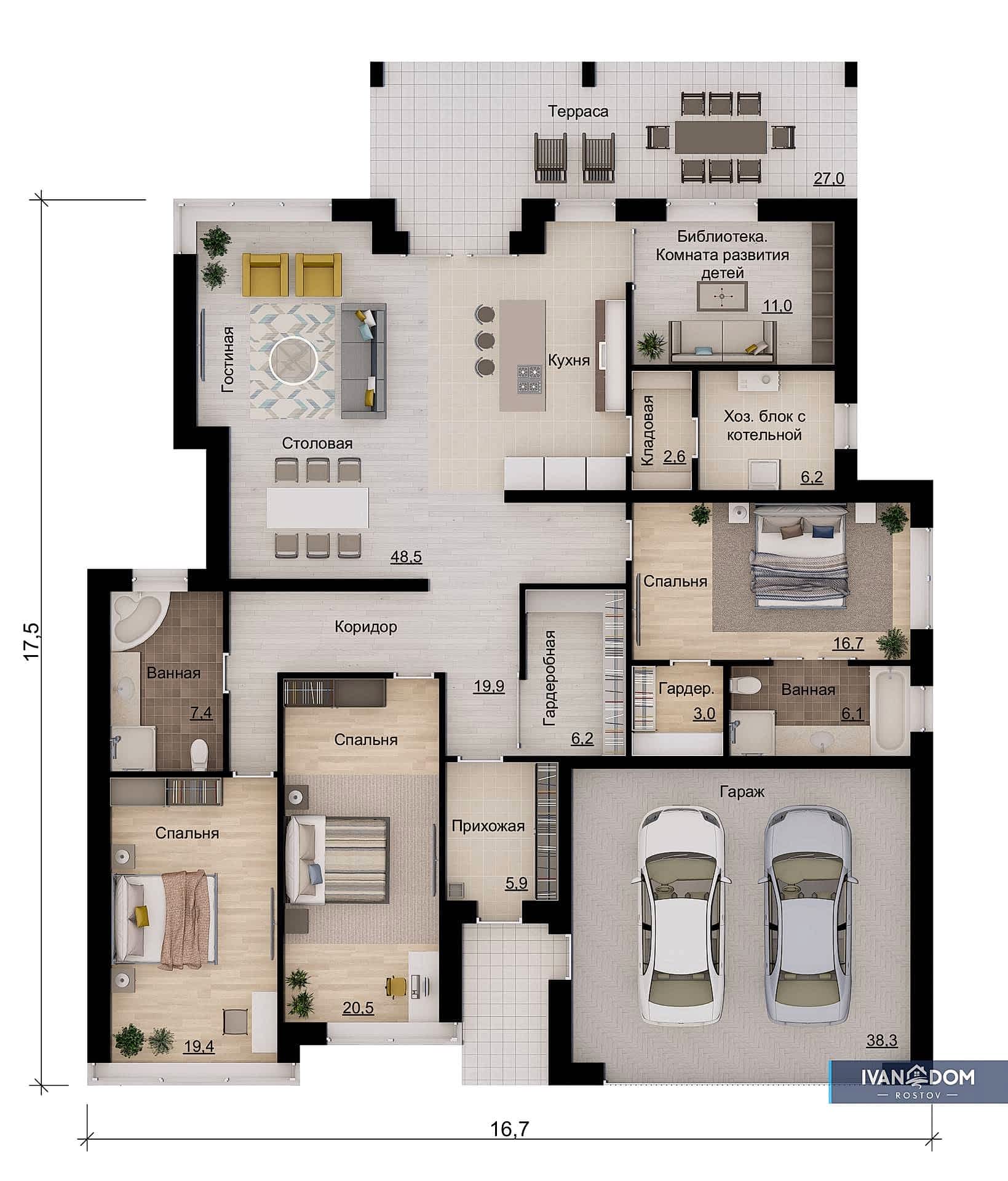 Этот проект подойдет искателям эстетики простора и свободы планировок. Его стилистику команда IVAN DOM определяет как “современная неоклассика”. Одноэтажный дом с гаражом на два автомобиля рассчитан на комфортное проживание большой гостеприимной семьи. Этот проект выбирают за беспрецедентный комфорт, с которым организовано его внутреннее пространство. Обратите на него внимание, если ищете проекты одноэтажных домов с террасой и гаражом.